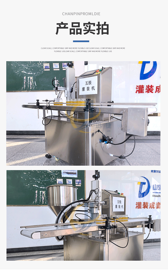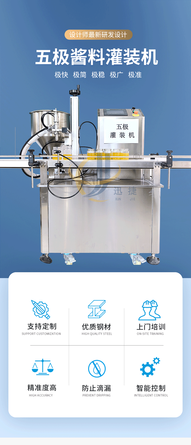 我公司新研發(fā)五極醬料灌裝機(jī),五極分為極快,極簡(jiǎn),極穩(wěn),極廣,極準(zhǔn),廣泛適用于各種膏霜、蜂蜜、洗衣液、洗發(fā)水、半流體、蜂蜜、醬料以及各種粘稠物料,該產(chǎn)品支持定制,選用306不銹鋼材質(zhì),灌裝精度高,防止滴漏,選用plc觸屏智能控制,防滴漏防拉絲,突破傳統(tǒng)的灌裝方式,可根據(jù)瓶子高度調(diào)整灌裝頭高度,采用防滴漏設(shè)計(jì),灌裝時(shí)不滴不漏。