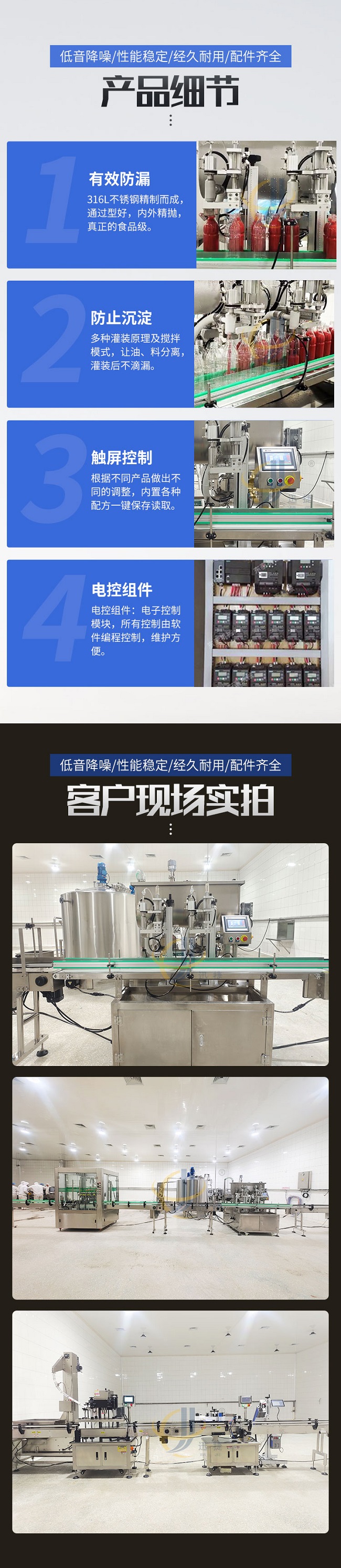 這款柱塞式辣椒醬灌裝機(jī)低音降噪、性能穩(wěn)定、經(jīng)久耐用、配件齊全,適用范圍廣泛用于辣椒醬、拌面醬、豆瓣醬、大塊肉醬、油辣醬、番茄醬花生醬、草莓醬等醬料的定量充填分裝。雙螺旋變頻攪拌,有效防止物料沉淀造成的計量不準(zhǔn)。物料通過三通轉(zhuǎn)向閥連接攪拌料箱,攪拌料箱里配置變頻攪拌系統(tǒng),攪拌系統(tǒng)讓物料在極低破壞率的情況下,得到充分的攪拌。